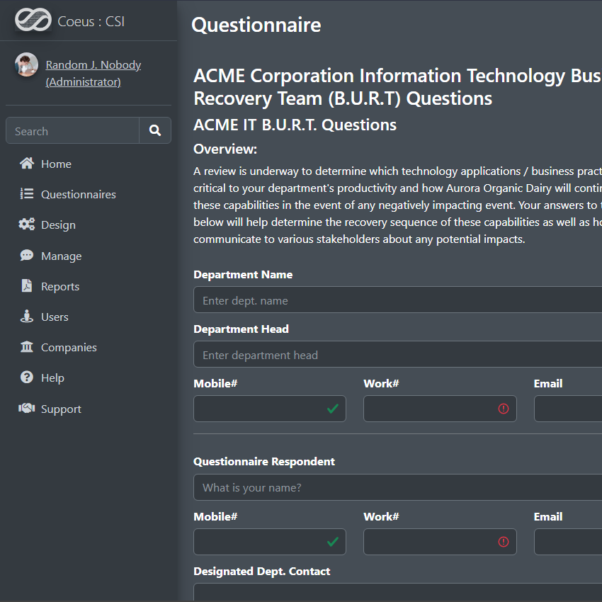This portal presents questionnaires and tools to determine which technology applications and business practices are most critical to your organization's productivity and how your company will continue to supply these capabilities in the event of any negatively impacting event. Your answers to the questions help determine the recovery sequence of these capabilities as well as how we will communicate to various stakeholders about any potential impacts.